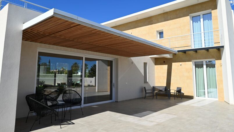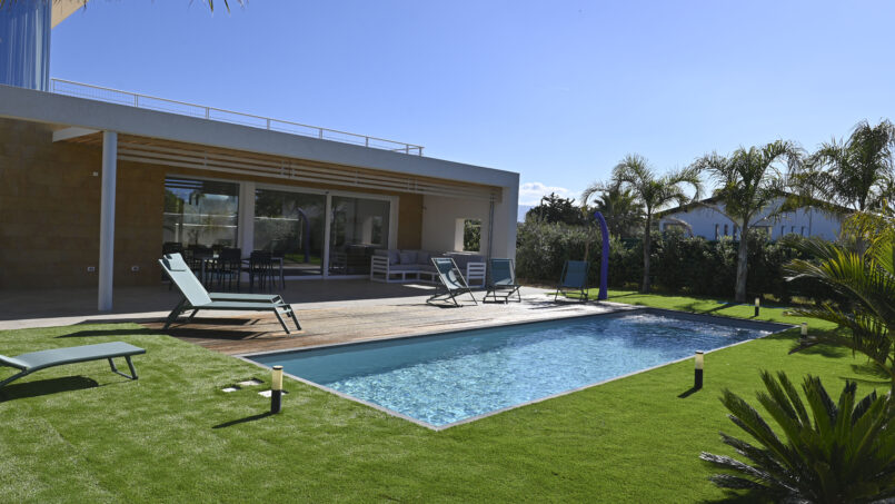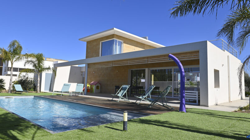 La villa si trova all’interno di un giardino recintato di proprietà privata di 1000 mq. All’interno c’è un ampio parcheggio esclusivo, piscina salata, zona solarium, veranda coperta e zona relax. Area barbecue.